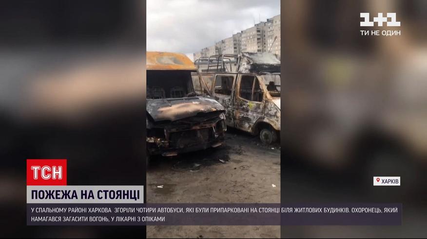 Одразу чотири автобуси згоріли цієї ночі у Харкові. Вони були припарковані на стоянці біля житлових будинків у спальному районі. Приборкати полум'я спочатку самотужки намагався охоронець, але обпікся і таки викликав рятувальників. Коли вони приїхали, буси уже були у вогні. Їх заливали піною та водою. Повністю загасили лише за півтори години, але від автобусів залишилися лише понівечені каркаси. 49-річного охоронця з опіками рук і обличчя забрали до лікарні. Попередня причина пожежі - підпал.