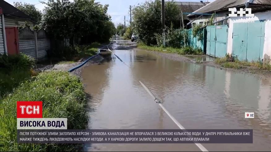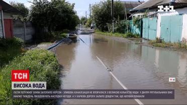 Зливи перетворили на річки дороги одразу в кількох містах країни. Після дощу херсонські соцмережі рясніють відео з різних районів, де вода переливалась через бордюри на дорогах, а люди переходили вулицю по коліна у воді. Усе через потужну зливу та проблему зливової каналізації, яка не впоралась з великою кількістю води. А у Харкові злива наробила лиха сьогодні по обіді, за якихось пів години. Залило не тільки вулиці, а і під'їзди. У двох районах вулицями пересуватись пішки стало неможливо.