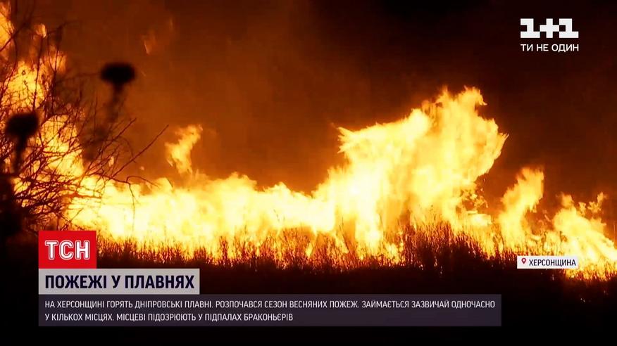 Дніпровські плавні горять у Херсонській області. Напередодні ТСН зафіксувала кілька осередків пожежі біля Олешків. Щодня на "101" отримують по кілька звернень про займання очерету й трави. Зазвичай горіти починає одночасно у кількох місцях. І, переважно, у вітряну погоду, коли вогонь швидко поширюється. І частішають пожежі саме навесні. Місцеві жителі у підпалах підозрюють браконьєрів, проте, паліїв затримують і карають вкрай рідко.