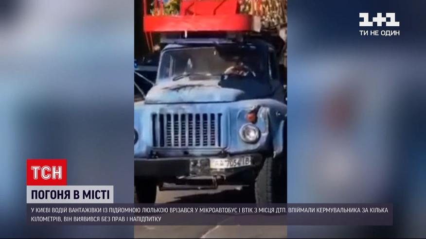 Погоня за вантажівкою з підйомником. У Києві довелося на швидкості затримувати водія "ЗІЛа" із підйомною люлькою. Спочатку він проскочив на червоний сигнал світлофора, потім протаранив мікроавтобус, а далі узявся втікати, подекуди ігноруючи ще й подвійну смугу та вискакуючи на тротуари.