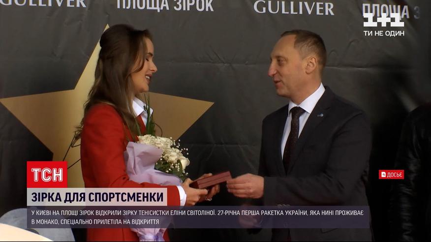 Зірка спортсменки. У Києві на площі зірок відкрили відзнаку тенісистці Еліні Світоліній. 27-річна перша ракетка України нині проживає в Монако, але спеціально для цього прилетіла на батьківщину. Попри негоду біля Торгівельного Центру зібралося багато її шанувальників. Серед них і двоє дітей з проєкту "Здійсни мрію" телеканалу "1+1" - Ксенія мріяла зустрітися з титулованою тенісисткою, а Андрій – мріє стати найкращим тенісистом світу.