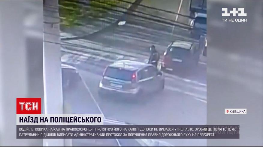 Наїхав на поліцейського і тягнув його на капоті допоки не врізався у інші авто. Мало не вбив правоохоронця водій у Київській області, який порушив правила проїзду перехрестя. Коли патрульний підійшов виписати адмінпротокол, кермувальник не відчинив двері, а після спробував втекти разом із копом на капоті.