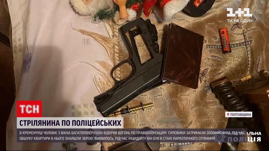 Обстріл поліцейських. У Кременчуці чоловік з вікна багатоповерхівки відкрив вогонь у двох правоохоронців. Силовики встановили, з якої саме квартири стріляв зловмисник і разом зі спецпризначенцями його затримали. Під час обшуку в чоловіка знайшли пневматичний пістолет. Стрільцю - 38 років, раніше він був судимий за браконьєрство і крадіжку. Виявилось, що під час інциденту він був в стані наркотичного сп`яніння.