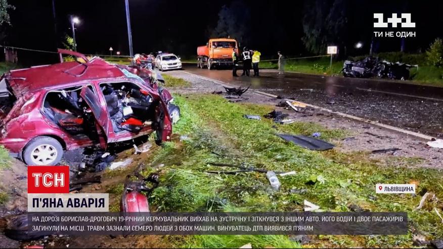 П'яна аварія у Львівській області - троє людей загинули, ще семеро у лікарні. На дорозі "Борислав-Дрогобич" зіткнулися два авто. 19-річний водій іномарки вилетів на зустрічну, там якраз їхав мінівен. Удар був такої сили, що обидві автівки зім'яло вщент. 40-річний чоловік, який був за кермом мінівена, а також двоє його пасажирів 16 та 20 років загинули на місці. Ще троє людей, що були в салоні, зазнали травм.