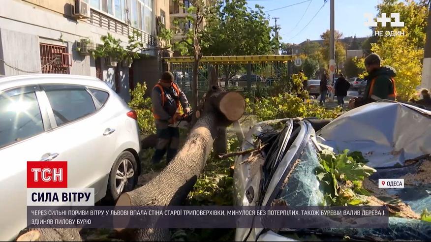 Стіна житлового триповерхового будинку впала у Львові. Не витримала сильних поривів вітру. Ніхто з мешканців та перехожих не постраждав. Але пошкоджені сусідні споруди. Вітер також валив дерева. Силу ураганного вітру відчули сьогодні і в Одесі. Там упало близько трьох десятків дерев - потрощили автівки і травмували водія.