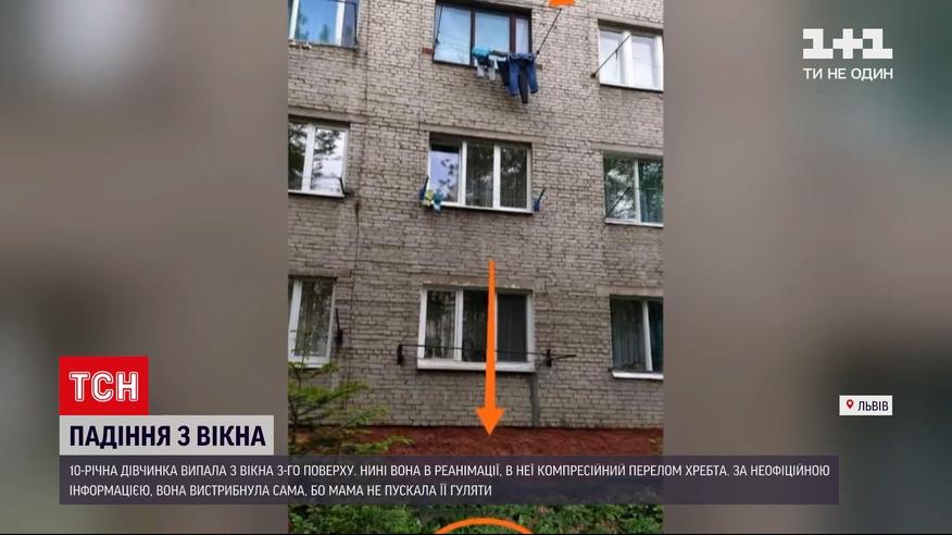 10-річну дівчинку, яка випала з вікна третього поверху, нині рятують у Львові. Дитина випала з вікна власної квартири. ЇЇ одразу ушпиталили, лікарі діагностували компресійний перелом хребта. Нині юна пацієнтка в реанімації, у стані середньої тяжкості, у свідомості. На сьогодні заплановані додаткові обстеження. У поліції з'ясували: родина, в якій виховується дитина, благополучна.
