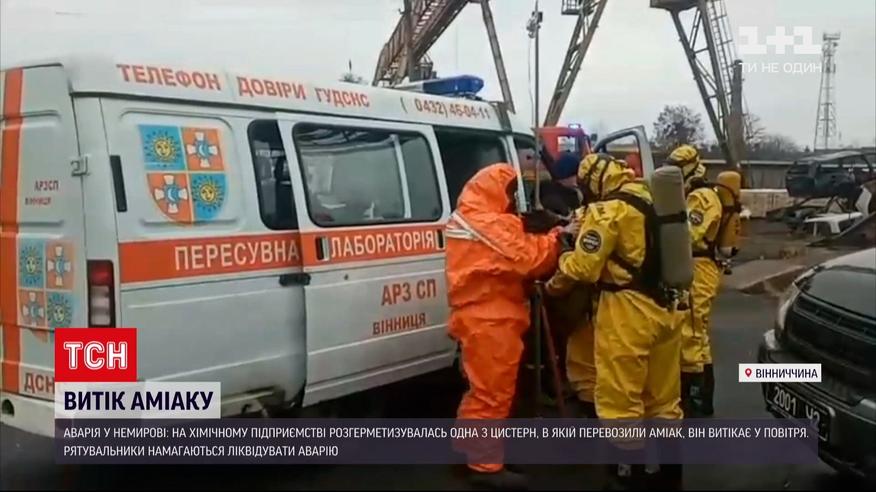 Витік аміаку у Вінницькій області. У Немирові на території одного з підприємств сталася хімічна аварія. Відкрилась залізнична цистерна, в якій перевозили аміак. Яке це сталося - поки невідомо. Опівдні місцеві почули різкий їдкий запах. На місце викликали рятувальників. Вже кілька годин триває ліквідація наслідків. Рятувальники працюють у захисних костюмах. Навколо цистерни струменями води створили спеціальний захисний купол, щоб аміак не випаровувався у повітря.