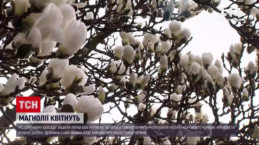 Перші магнолії розквітли у столичному ботсаду. Цьогоріч їхнє цвітіння запізнилося на кілька тижнів через затяжну зиму. Поки що можна побачити розквітлі бутони лише кількох ранніх сортів білих дерев. Але уже за два тижні почнуть розпускати квіти і інші - жовті, червоні, кремові та рожеві магнолії. Милуватися деякими з них можна буде аж до середини літа.