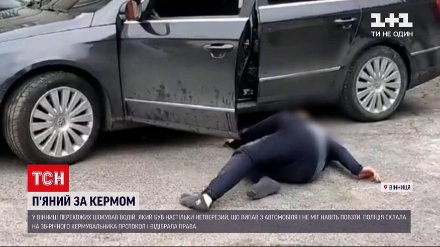 Повзав і не міг втриматись навіть на чотирьох. У Вінниці п'янючий водій шокував перехожих. Чоловік заїхав на територію підприємства, якимось чином зумів припаркувати авто, з якого буквально випав, до того ще й розбив собі обличчя. Відео потрапило у мережу. На кадрах видно, що водій, впавши на землю, намагається звестись на ноги і знову доповзти до машини, але йому це не вдається. Очевидці викликали поліцію.