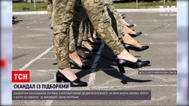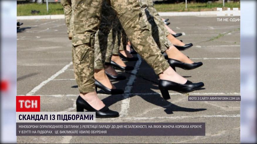 Нардепи вимагають, щоб міноборони провело службове розслідування та пояснило закупівлю туфлів на підборах для жінок-військовослужбовиць. Скандал зчинився після того, як міноборони оприлюднило світлини з репетиції параду до Дня Незалежності. На них жіноча коробка марширує у чорному взутті на підборах. Це викликало бурхливу реакцію у суспільстві. Критики писали, що витримати багатогодинну стройову підготовку у такому взутті занадто складно.