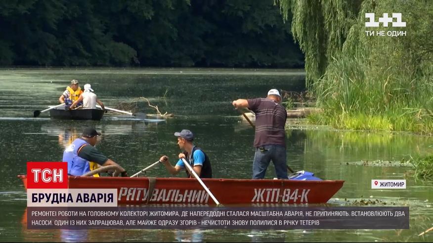 У Житомирі вночі не припинялися роботи на головному колекторі, де напередодні сталася масштабна аварія. Встановлюють два нових насоси. Один з них запрацював, але тут же згорів, і нечистоти знову полилися в річку.