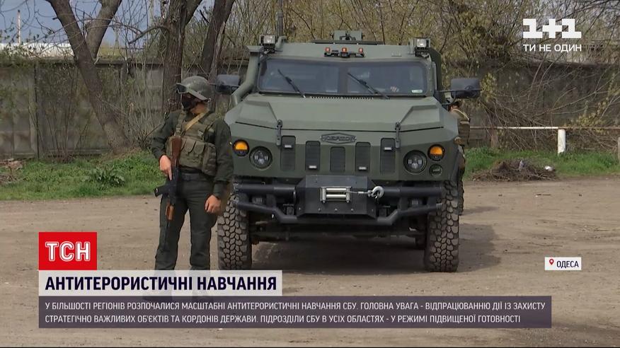 Масштабні антитерористичні навчання СБУ розпочалися в більшості українських регіонів. Головна увага - відпрацюванню дій із захисту стратегічно важливих об’єктів та кордонів держави. Так, в Одесі на виїзді з міста нині чергують автоматники. Найбільша увага - миколаївському напрямку. Працюють Нацгвардія й поліція. Зупиняють автомобілі, оглядають салони й багажники, перевіряють документи. Тренування триватимуть три дні. Українців просять ставитися до можливих незручностей із розумінням і підкреслюють – діють виключно за законом.