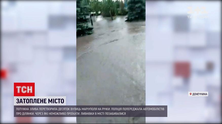 Маріуполь поплив. У місті через потужну нічну зливу затопило відразу десяток вулиць. Машини плавали у воді, місцями прохід пішоходів був неможливий або ускладнений. Поліція попереджала водіїв про необхідність оминати затоплені ділянки. Місцями забилися ливнівки.
