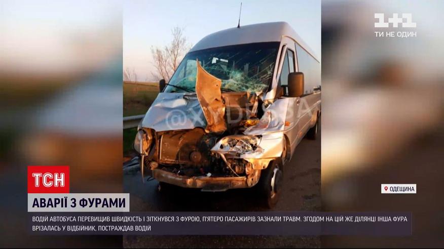 Шестеро травмованих. Такі наслідки одразу двох аварій з контейнеровозами, що сталися в Одеській області. Спочатку в ДТП потрапила маршрутка - її водій перевищив швидкість, не впорався з керуванням та зіткнувся з вантажною фурою, яка їхала попереду. А за кілька годин на цьому самому відрізку - нова ДТП. Водій фури добряче потрощив металеві відбійники. Вантажівку розвернуло, вона повністю заблокувала рух двома смугами, утворився величезний затор.