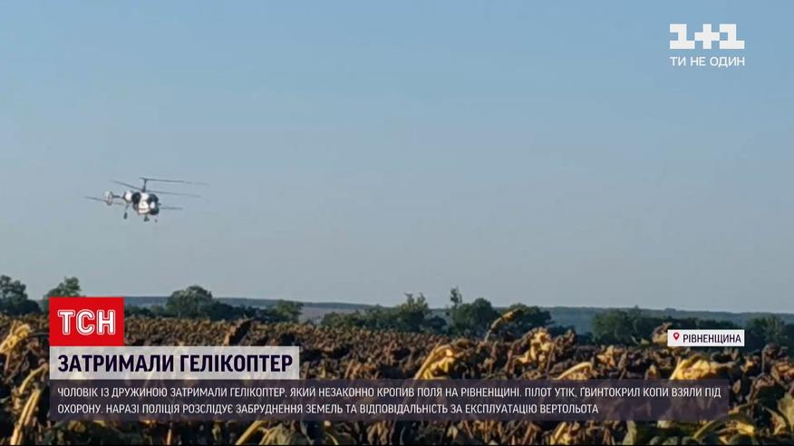 Селянин із дружиною затримали гелікоптер, який незаконно кропив поля в Рівненській області. Ґвинтокрил орендарів біля села помічали кілька днів поспіль, однак упіймати не могли. Коли побачили знову - взялися переслідувати. Спершу полями машиною, а коли вертоліт сів заправлятися - навіть бігли до нього, щоби перешкодити злету. Подружжю це вдалося. Селяни викликали поліцію. І хоч пілот до їхнього приїзду втік, ґвинтокрил копи взяли під охорону. З'ясувалося, ним заборонено літати вже не один десяток років.
