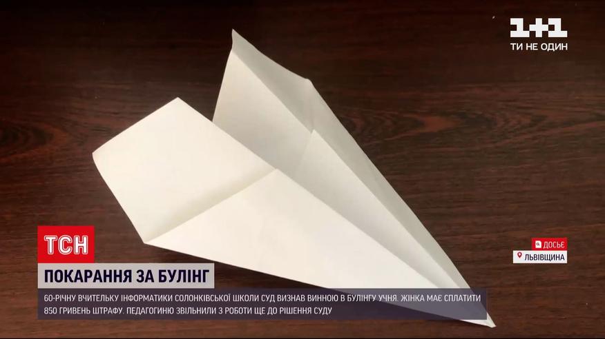 Винна в булінгу і має спалатити штраф. Суд визнав вчительку Солонківської школи у Львівській області винною у цькуванні учня. Тепер 60-річна педагогиня має заплатити 850 гривень штрафу. Провадження проти вчительки інформатики розпочали через інцидент на уроці. Надія Волощук змушувала семикласника проковтнути паперовий літачок.