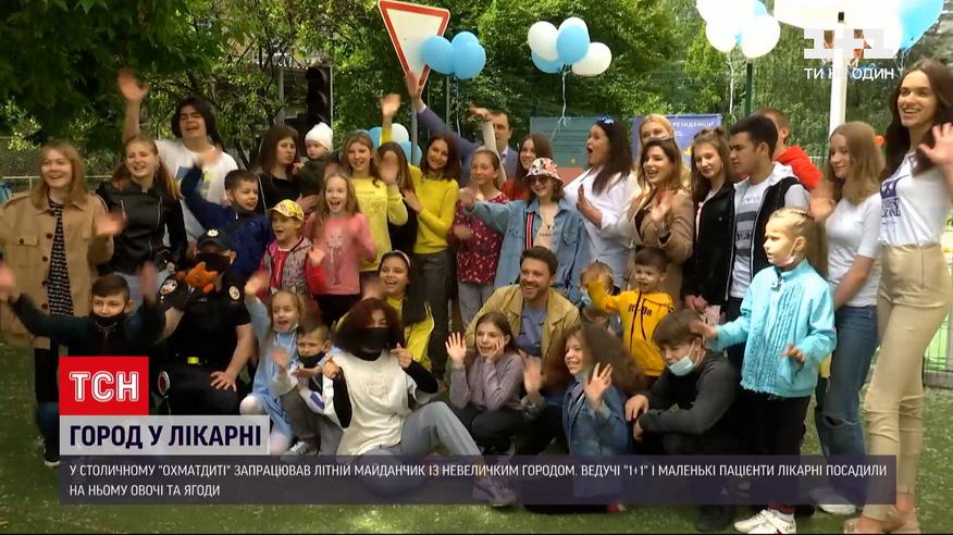 Горох, морква, капуста, полуниця - на маленькому городі у лікарні. До всесвітнього Дня захисту дітей в столичному "Охматдиті" його маленькі пацієнти разом із ведучими "1+1" на літньому майданчику клініки висадили город "школи супергероїв".