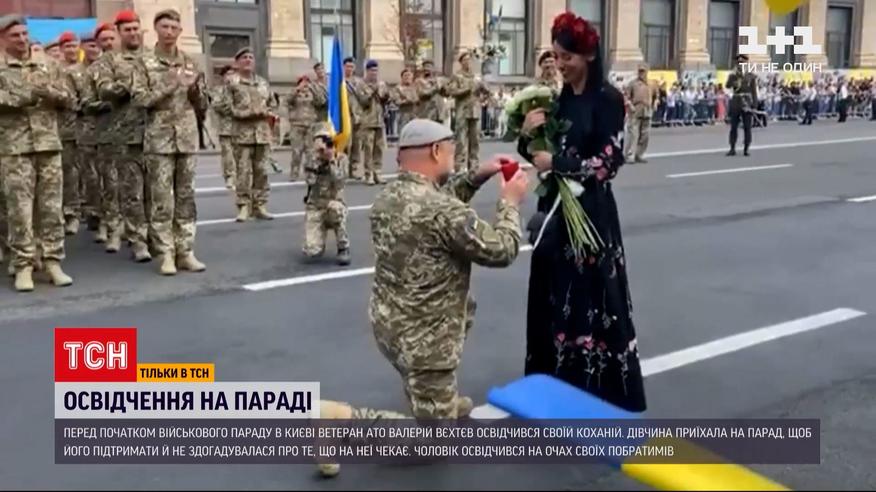 Із параду - під вінець. Ветеран АТО Валерій Вєхтєв освідчився своїй коханій. Сталося це на самому Майдані Незалежності, де за кілька хвилин після цього він збирався йти маршем у колоні ветеранів. Його дівчина Людмила приїхала на парад з Вінницької області й гадки не мала, що тут на неї чекає. Та щойно колона вишикувалася, Валерій зробив крок уперед і на очах у своїх побратимів освідчився. Разом пара вже 6 років. Хоч і познайомилися ще до війни, але довгий час просто дружили.