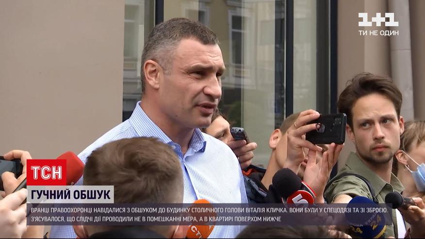 Обшукували, але не його. Правоохоронці прийшли з обшуками до будинку, де мешкає столичний голова Віталій Кличко. Вони були у спецодязі, шоломах та зі зброєю. Поспілкувався з силовиками столичний голова, коли повернувся з тренування. І повідомив, що з обшуками прийшли не до нього, а в квартиру поверхом нижче. Віталій Кличко каже, що та квартира належить співробітникам Оперного театру.