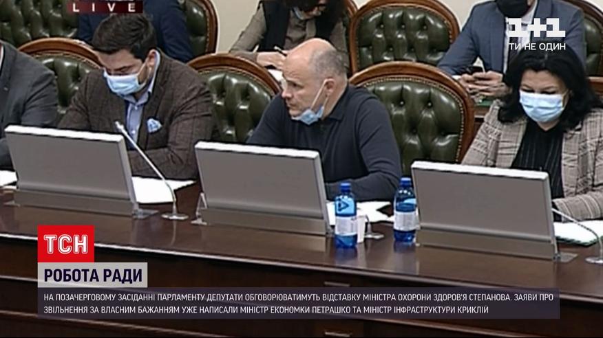 Верховна Рада може розглянути відставку трьох міністрів вже завтра. Для кадрових рішень депутати більшості збирають голоси для проведення позачергового засідання. Нардепи мають розглянути заяви про відставку міністра інфраструктури Владислава Криклія та міністра економіки Ігоря Петрашка, а також подання прем’єр-міністра про звільнення з посади очільника МОЗ Максима Степанова. Міністру охорони здоров’я парламентарії закидають провал вакцинації від коронавірусу.