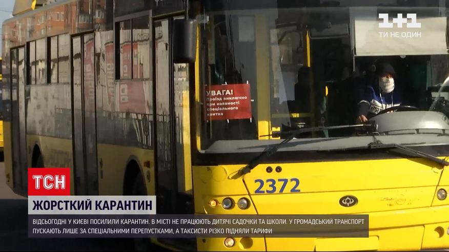 Порожній громадський транспорт, втричі більша ціна за таксі і масштабні затори: відсьогодні у Києві жорсткий карантин. Щонайменше до 16 квітня не працюватимуть початкова школа та дитсадки. А метро та громадським транспортом можна скористатися тільки за наявності спецперепустки. Через це сьогодні чимало пасажирів так і не змогли зайти у транспорт, бо ще не встигли отримати спецквитки, а ціна послуг таксі зросла у рази і сягала по місту тисячі гривень.