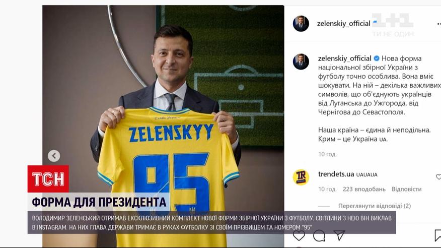 Форма для президента. Володимир Зеленський отримав ексклюзивний комплект нової форми нашої збірної з футболу. Номер на футболці - 95. Над ним прізвище - Зеленський. Світлини з нею глава держави виклав в "Інстаграм" і написав, що "нова форма точно особлива і вміє шокувати". На футболці зображена карта України із незаконно анексованим Росією Кримом та гасло "Слава Україні! Героям слава!". І це неабияк роздратувало сусіда-агресора - російський футбольний союз поскаржився до УЄФА - напис "Слава Україні" назвав "гаслом українських націоналістів".