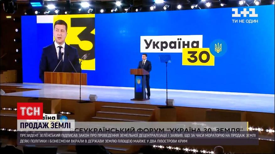 П'ять мільйонів гектар землі вкрадено в України. Це вдалось чиновникам і бізнесменам через непрозору систему обігу землі, так вважає президент Володимир Зеленський під час форуму "Україна 30. Земля". Він порівняв цю територію із двома півостровами Крим. Під час виступу Зеленський підписав законопроєкт про внесення змін до земельного кодексу щодо удосконалення системи управління та дерегуляції у сфері земельних відносин.