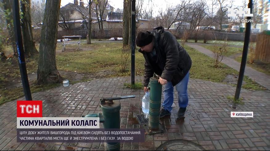 Без газу, світла і води. У Вишгороді, місті-супутнику Києва, - комунальний колапс. Від ночі жителі майже всього міста опинилися без водопостачання. Щоби набрати води, люди від ранку займали черги до міських бюветів. Але й вони не працювали. Усе - через обрив ліній електропередачі. Без струму зупинилися помпи міського водоканалу. А частина міських кварталів опинилася без світла, води та газу.
