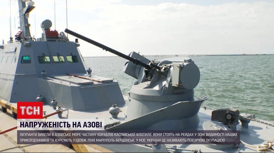 Десантні та артилерійські катери ВМС Росії і швидкісні ФСБ. З Каспійської флотилії окупанти нагнали цілий флот в Азовське море. Частина пішла. А інші судна лишились. Окупанти стоять на рейдах у зоні видимості наших прикордонників. Уздовж лінії Маріуполь-Бердянськ російські катери постійно курсують, демонструючи свою присутність. Таку поведінку наш очільник МЗС назвав повзучою окупацією. Так Москва хоче заблокувати українські порти на Приазов'ї.