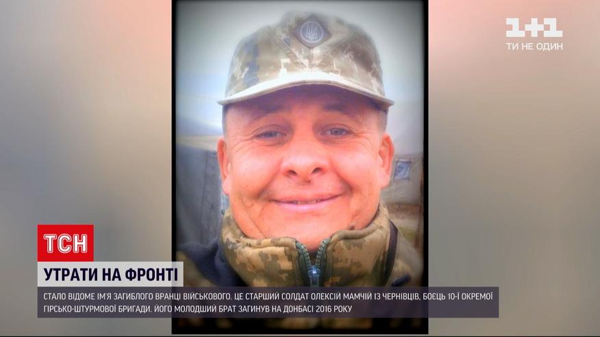 Стало відомо ім'я бійця, який загинув сьогодні зранку біля Майорська у Донецькій області. Це 40-річний старший солдат Олексій Мамчій з Чернівців, боєць 10-ої окремої гірськоштурмової бригади. Він помер від смертельного поранення після того, як бойовики з безпілотника скинули на позиції бригади гранати. Ще двоє військових отримали поранення.