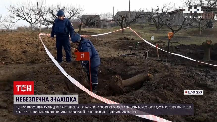 100-кілограмову авіабомбу часів 2-ї світової виявили в Запорізькій області. На небезпечну знахідку натрапили господарі обійстя в селищі Василівка, коли вирішили позбутися сухих дерев. Під час корчування почули дзвін металу, а, коли розкопали яму більше, побачили величезну бомбу. На місце виїхали понад два десятки рятувальників. Будинок разом з садом оточили правоохоронці, про небезпеку тут попередили всіх жителів вулиці.