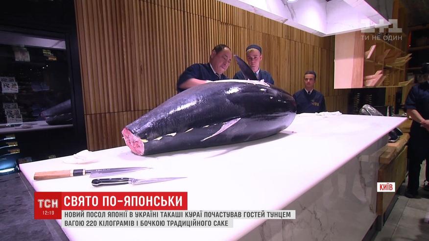 Тунець вагою двісті двадцять кілограмів, якого ледве підняли восьмеро офіціантів, і бочка саке. Новий посол Японії в Україні Такаші Кураї власне призначення відзначив яскравою вечіркою. З гігантської риби, яка прилетіла до Києва бізнес-класом, влаштували ціле шоу. Запивати їжу годилося саке у чотирнадцять градусів.