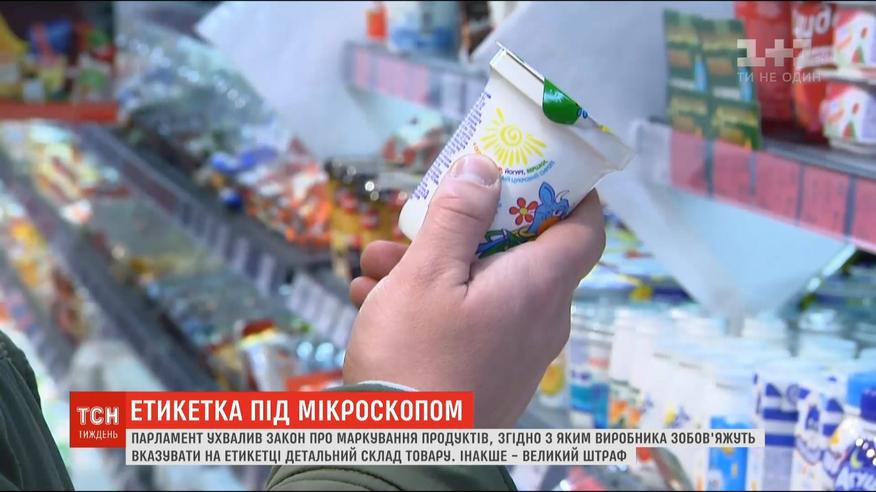 Парламент ухвалив закон про маркування продуктів, згідно з яким виробника зобов'яжуть вказувати на етикетці детальний склад товару. Інакше - великий штраф. На етикетках мають писати все, з чого зроблений продукт. Буквально всі добавки. А найбільш небезпечні компоненти - виділяти. Окрім того, новий закон змусить магазини вказувати продукт, який був розморожений. А якщо заморожений - то зазначати масу льоду.