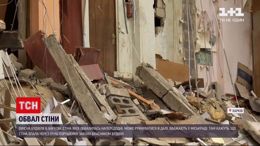 Офісна будівля у Харкові, стіна якої обвалилась, може руйнуватися і далі, вважають у міській раді. Кажуть: власник повинен обстежити решту приміщень, аби не сталося повторних обвалів. Частина 4-поверхової будівлі рухнула напередодні. Минулося без постраждалих, адже в той час усередині нікого не було. А от під уламками лишилися меблі та особисті речі людей. Зі слів власника, обвалились офісні приміщення, які планували зносити.
