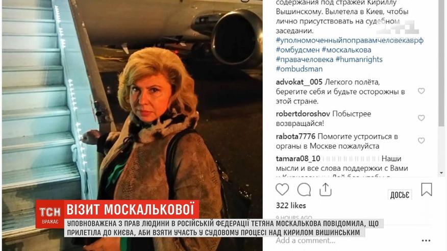 Про свою дорогу Тетяна Москалькова відзвітувала в соцмережі. Спочатку сфотографувалася біля літака білоруських авіаліній, а вже за декілька годин виклала фото з хештегом "Київ". Як написала сама Москалькова, до України вирушила, аби особисто взяти участь у судовому засіданні у справі Кирила Вишинського.