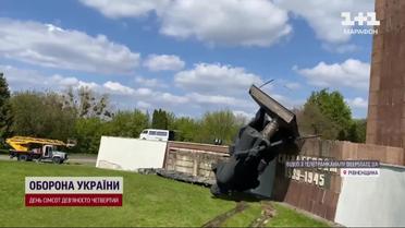 Останній пам'ятник із радянською символікою, що був на балансі міста, знесли в Рівному. Скульптурний комплекс зведений до 40 річниці Другої світової війни на Пагорбі слави. Під декомунізацію підпав барельєф та фігури радянських солдатів. Із гуркотом сьогодні вони полетіли додолу. Уламки віддадуть на брухт. А на вторговані кошти придбають дрони для захисників - уже про-анонсував виконувач обов'язків міського голови. Деталі – в ТСН.