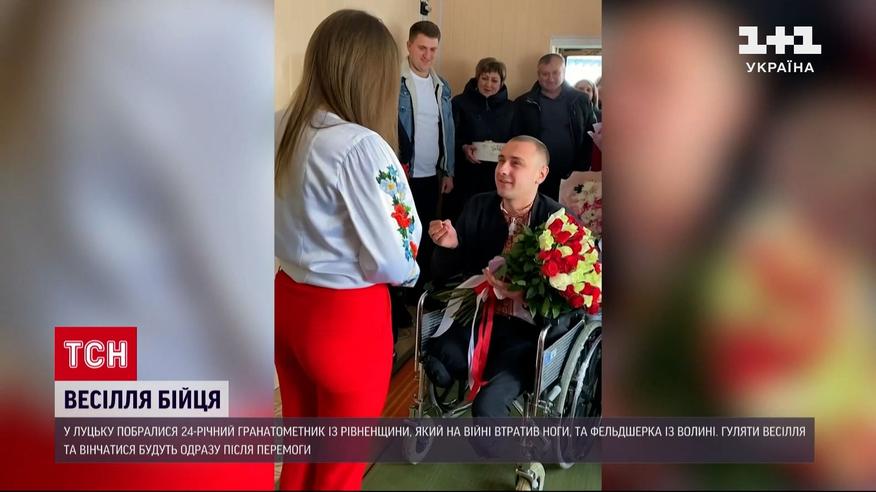 Відтепер - подружжя. У Луцьку побралися 24-річний гранатометник із Рівненщини, який на війні втратив ноги, та фельдшерка із Волині. Відео їхнього сватання лише за добу у соцмережах набрало майже три мільйони переглядів. Влітку на Миколаївщині боєць дістав тяжкі поранення. Йому врятували життя, однак хлопець лишився без ніг. Та це не стало на заваді щастя. Він освідчився коханій і вона відповіла «Так». Нині закохані одружилися. На церемонії були не лише родичі та друзі, а й побратими Сергія. А от вінчатися та гуляти весілля закохані запланували вже після перемоги.