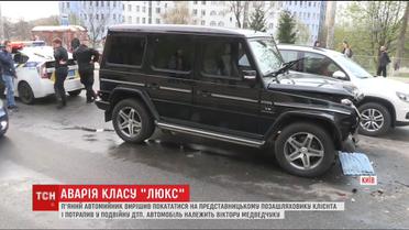 На перехресті водій позашляховика Mercedes-Benz представницького класу забув загальмувати і врізався в мікроавтобус, а той зачепив Lanos. Подейкують, що машину на автомийці залишила дружина Медведчук Оксана Марченко. Після цього нетверезий працівник автомийки вирішив покататися на чужому авто.