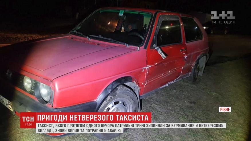 Історію про нього ТСН розповідала напередодні. У Рівному різні патрулі протягом кількох годин по черзі зупиняли одного й того самого таксиста напідпитку. На таксиста копи тричі склали протоколи та брали зобов’язання не сідати за кермо. Але невгамовний таксист знову випив та поїхав кататися. Неподалік Рівного він зіткнувся з іншим легковиком. На нього склали четвертий протокол.