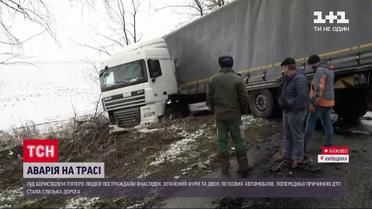 Фура зіткнулася з двома легковиками. Попередньо причиною ДТП називають слизьку дорогу. На місці працює ТСН.