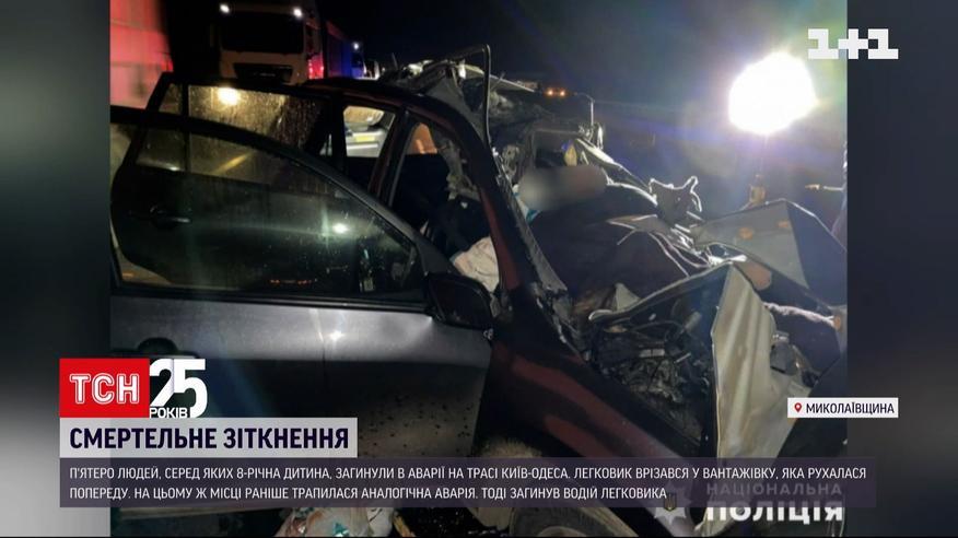 П'ятеро людей загинули у аварії на трасі "Київ-Одеса". Серед загиблих 8-річна дитина. Зіткнулися легковик та вантажівка. Обидва автомобілі їхали до Одеси. В районі села Курячі Лози легковик врізався у вантажівку. За попередньою інформацією, фура, яка їхала попереду, почала щось об'їжджати на трасі і в цей момент в неї ззаду і увігналась інша машина. У салоні було 5-ро людей. Двоє чоловіків, дві жінки та дитина. Всі загинули на місці. Водій фури не постраждав. За інформацією поліції, зранку на цьому ж місці була схожа аварія.