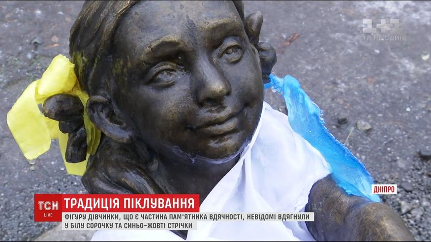 Пам’ятник дівчинки у музеї АТО в Дніпрі вдягли в сорочку і прикрасили бантиками