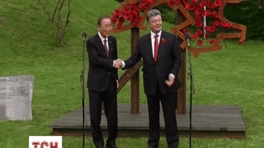Президент України Петро Порошенко і генеральний секретар Організації Об'єднаних Націй Пан Гі Мун покласти квіти до меморіалу Другій світовій війні Києві напередодні 70-річчя Перемоги. Пан Гі Мун наголосив, що світ підтримує Україну в час конфлікту на Сході України, і шукає шляхи мирного вирішення протистояння.