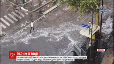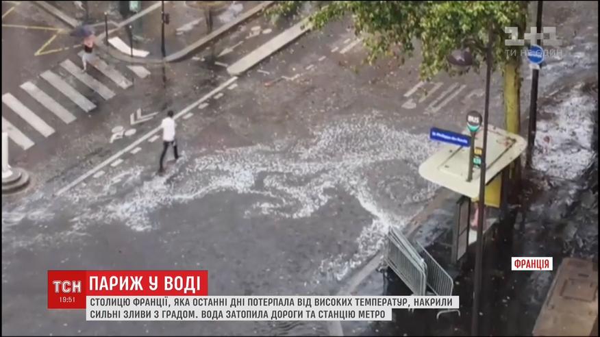 Після спеки крижані зливи. Париж накрили рясні дощі з градом. Французька столиця, яка весь тиждень потерпала від високих температур, тепер буквально потонула у воді. Частини вулиць затопило, пориви вітру сягали 100 кілометрів за годину. Місцеві ЗМІ повідомляють, що за кілька секунд масштабні повені затопили одну зі станцій метро. Брудна вода заблокувала пасажирів, які ніяк не могли дістатися виходу.