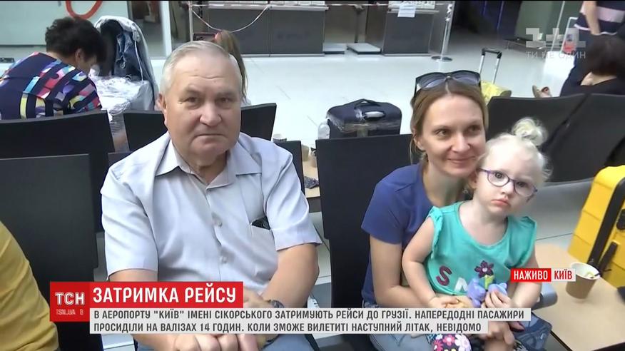 Пасажири, які збиралися вилетіти до Грузії, щонайменше півдня проведуть на летовищі у Жулянах. Напередодні такий самий рейс затримали на 14 годин, бо літак, який мав доправити людей до Грузії, відіслали в Ізраїль.