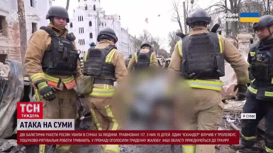 Сьогодні, у Вербну неділю, росіяни вдарили двома балістичними ракетами по центру Сум! Цього дня багато вірян ідуть до церкви, хтось повертався із богослужіння. Можливо, навіть тим самим тролейбусом, який російські Іскандери спопелили ущент! Україна вкотре оплакує жертв. А українська розвідка тим часом з’ясувала: масове вбивство мирних людей — на руках 112 та 448 ракетних бригад РФ. Саме розрахунок 112 бригади півтора року тому вдарив по селу Гроза на Харківщині. Журналістка ТСН Оксана Солодовник — розповість детальніше.