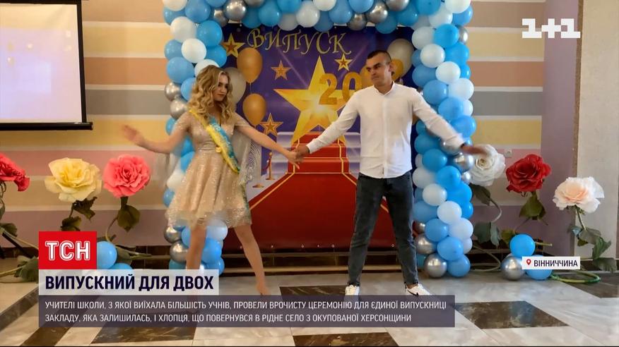 Переселенець та відмінниця. У селі Красне на Вінниччині влаштували випускний лише для двох учнів. Адже решта з початком війни виїхали із селища. На врочистій лінійці була єдина випускниця цієї школи Марія Огінська. Проте на святкування запросили і Романа Гайдаєнка, юнака, який колись теж навчався в Красному, але потім переїхав на Херсонщину. Коли ж туди прийшли зі зброєю російські військові - повернувся до рідного села, щоб отримати атестат і скласти ЗНО. Такий випускний - уперше в історії села, кажуть педагоги. І сподіваються, що наступного року учнів буде більше.