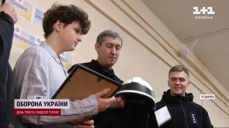 У Дніпрі відзнаку від державної служби назвичайних ситуацій отримав семикласник Тимофій Потеряйло. 14 січня під час влучання російської ракети у багатоповерхівку хлопчик катався на велосипеді неподалік. І одразу після вибуху, не злякавшись потужної пожежі - поїхав на місце трагедії. Ще до приїзду швидкої та рятувальників знаходив людей, яким потрібна допомога, а далі скеровував до них лікарів. Поки тривала рятувальна операція, школяр був поряд із пошуковцями, носив їм їжу та воду. Від ДСНС Тимофій отримав офіційну подяку. А ще йому вручили справжній пожежний шолом. Хлопець каже: той йому знадобиться у майбутньому. Після трагедії у Дніпрі хлопчик вирішив: стане рятувальником.