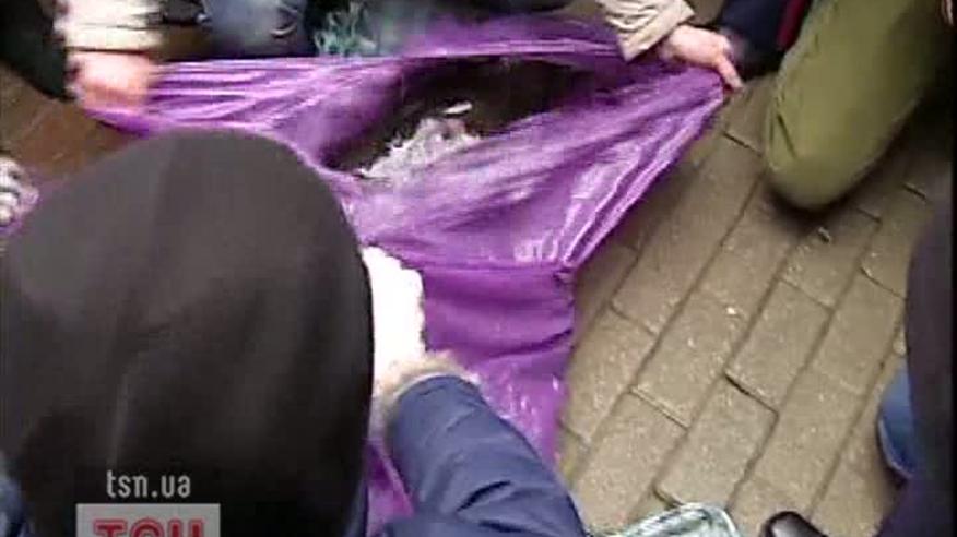 Активісти Всеукраїнського товариства захисту тварин "За життя" під час акції проти отруєння собак принесли до будівлі Кабмін труп тварини, яка, на їхню думку, була отруєна.