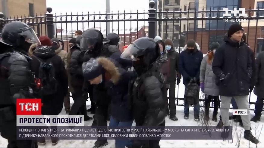 Рекордні понад 5 тисяч затриманих під час недільних протестів у Росії. Найбільше – у Москві та Санкт-Петербурзі. Акції на підтримку опозиціонера Олексія Навального прокотилися десятками російських міст. Під час недільних протестів вперше повністю перекрили центр Москви, а силовики діяли особливо жорстко. ТСН продовжить.